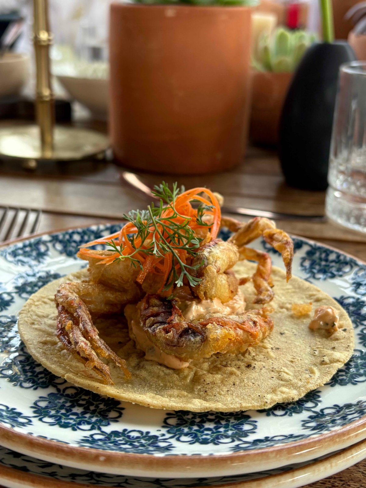 El segundo tiempo subió la apuesta con un taco de jaiba de concha suave. La textura perfectamente frita de la jaiba contrastó con una salsa tártara de chipotle ligeramente ahumada y el toque ácido de la zanahoria encurtida. Un imperdible para quienes buscan texturas complejas.
