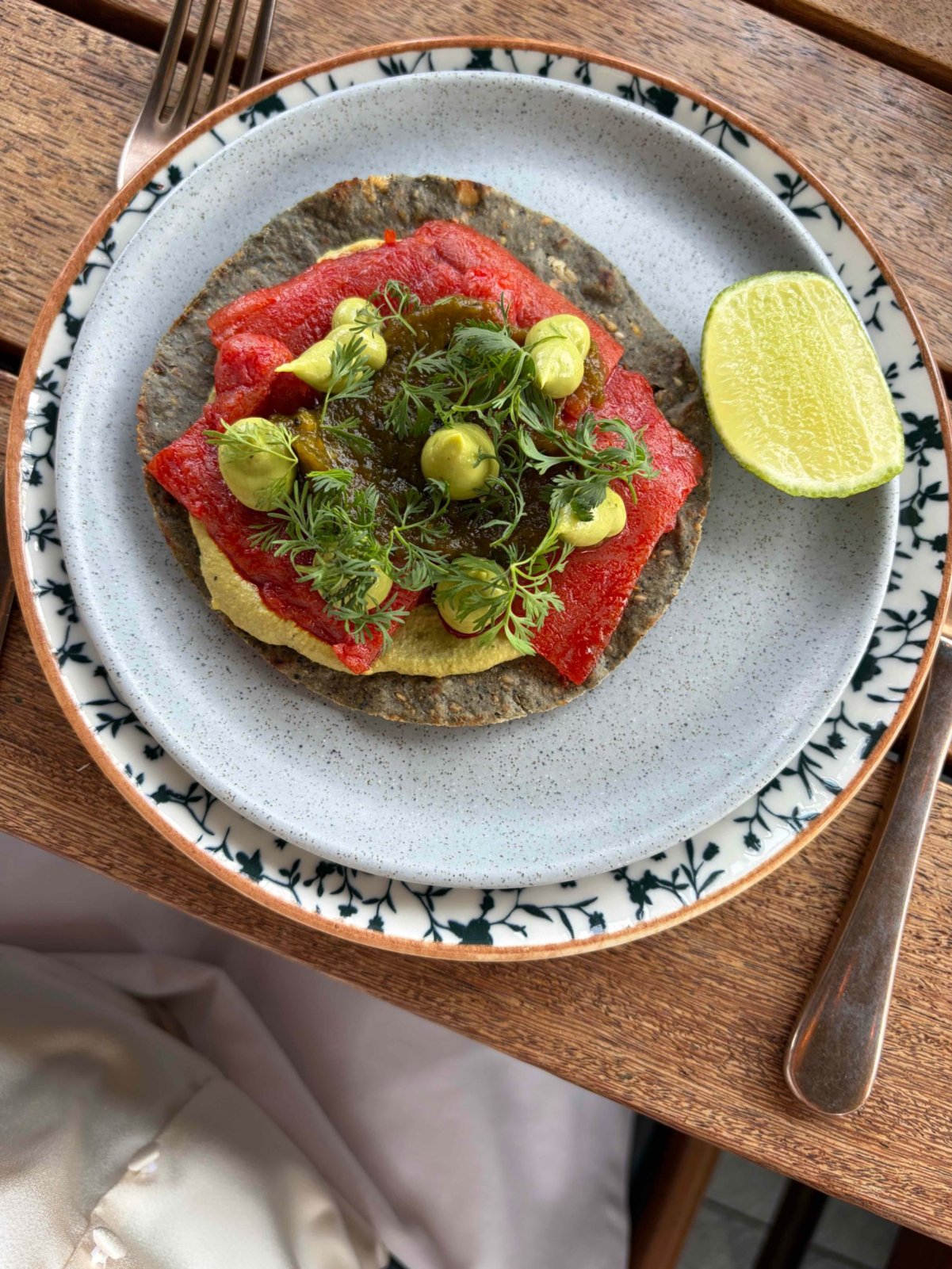 La cocina de Cabuya se centra en la frescura de los productos marinos y la coctelería de autor. Así fue nuestro recorrido gastronómico. Comenzamos con una tostada de atún que destaca por su balance. El aguacate y el cilantro aportan la cremosidad y el frescor necesario, pero es la salsa de chile poblano la que amarra los sabores con un picor elegante.