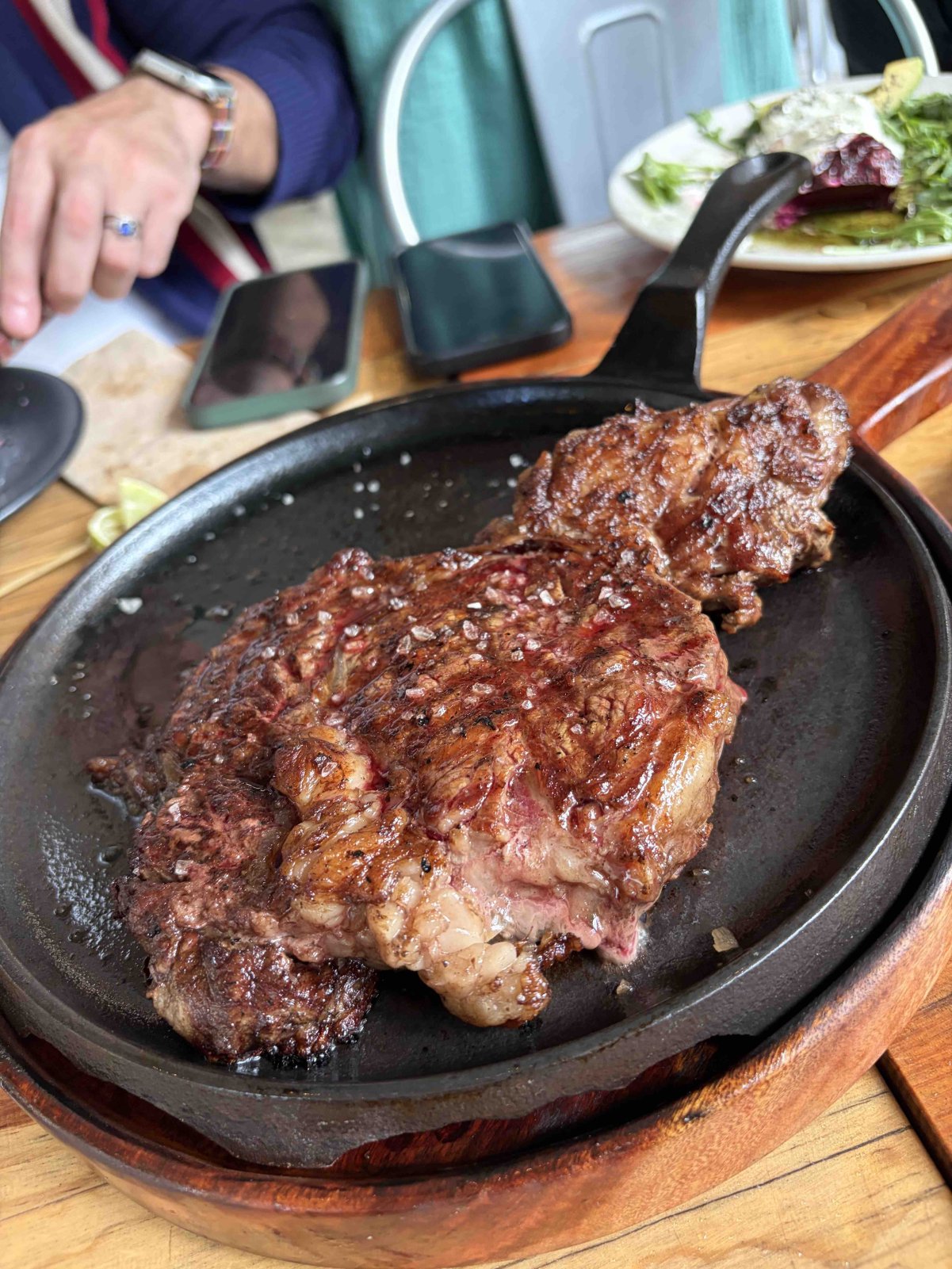 Como buena parrilla, el momento estelar llegó con los cortes. El rib eye y el asado de tira se sirvieron en su punto, con ese exterior sellado y centro jugoso que confirma el dominio de la brasa. Los acompañamientos —puré de papa y camote, verduras a las brasas y papas fritas— completaron una experiencia pensada para compartir al centro y disfrutar sin prisas.
