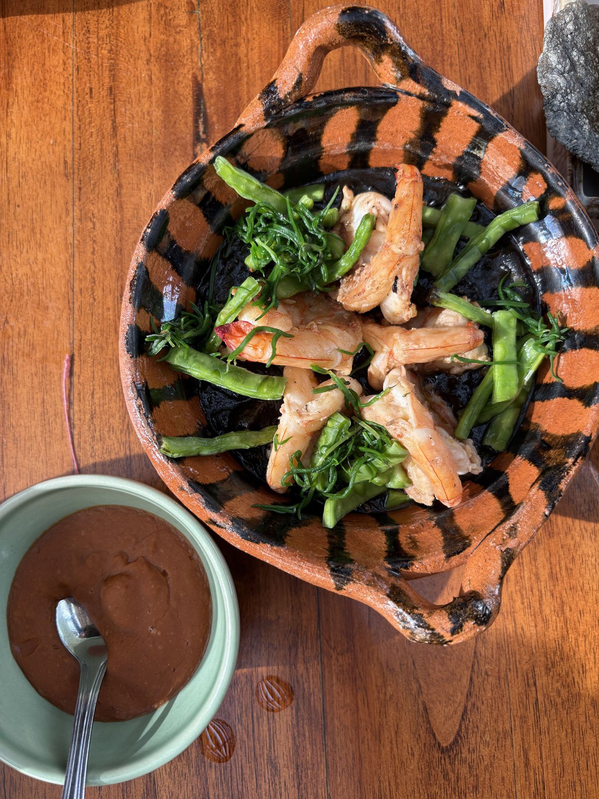 Los romeritos con mole y camarón reafirman el respeto por la cocina de raíz. El mole acompaña con sutileza, dejando que los romeritos conserven su carácter vegetal y que el camarón aporte salinidad y textura. Un platillo que demuestra cómo la tradición puede sentirse vigente cuando se cocina con oficio.